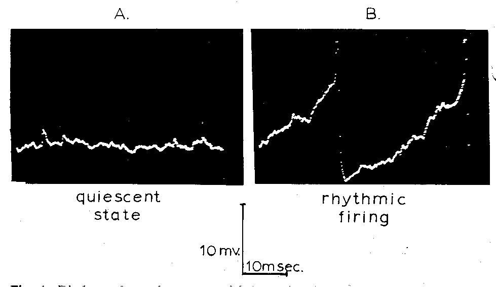 Fig. 1. Displays of membrane potential as a function of time showing synaptic noise in a quiescent motoneuron (A) and the ramp-like approach to the firing level with superimposed noise (B) when repetitive firing was induced by current passed through the membrane. Note that the action potentials are off scale in B. Because these records are displays of digitalized data from LINC memory, the separate data samples are visible as dots where the membrane potential was changing rapidly.Although data from intracellular recordings are in qualitative agreement with our proposed model, only quantitative evidence can establish that more complicated assumptions are unnecessary. For example, it would be very difficult, on the basis of mere inspection of records, to say that some source of noise other than synaptic noise is not present, or that synaptic noise does not interact with the ramp generating processes instead of simply adding to the membrane potential as it approaches the firing level.