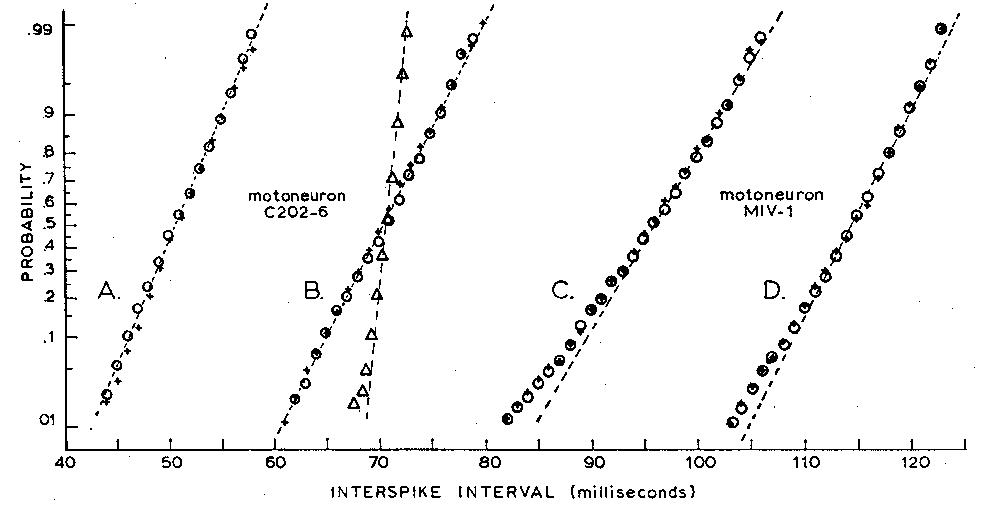 Cumulated interspike interval histograms from four lists of intervals yielded by two motoneurons are shown in Fig. 2. These plots are made on a probability scale so that a Gaussian interspike-interval histogram would give a straight line; histograms from cells not included in the illustration were also approximately Gaussian [as opposed to exponential, multimodal, and so forth (1)]
