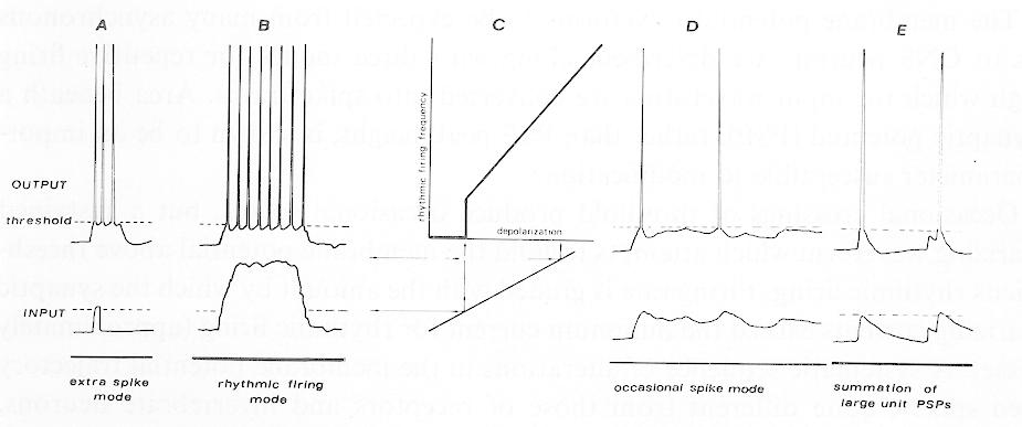 Occasional crossings of threshold produce occasional spikes, but a sustained depolarizing waveform which attempts to hold the membrane potential above threshold elicits rhythmic firing. Firing rate is graded with the amount by which the synaptic depolarizing currents exceed the minimum current for rhythmic firing (approximately rheobase). A systematic sequence of alterations in the membrane potential trajectory between spikes, quite different from those of receptors and invertebrate neurons, may control the firing rate and give rise to sudden changes in the 'gain' of this conversion of depolarizing current into firing rate. The different implications of synaptic location during the occasional spike mode and the rhythmic firing mode are discussed, as is the role of the antidromic invasion of the soma-dendritic region during rhythmic firing.