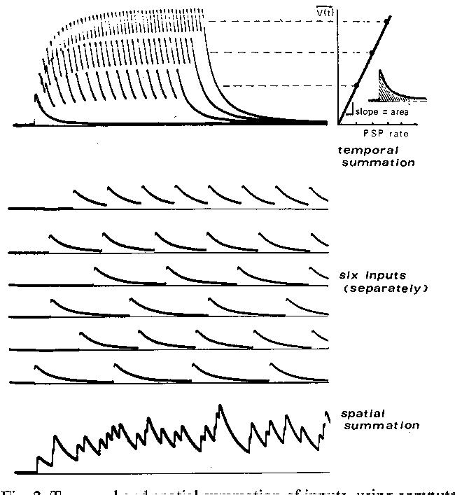 The PSP arrival rates illustrated for temporal summation are rather high; what if PSPs come along more slowly? As seen for 6 inputs with low rates in Fig. 2, a PSP can decay almost to the baseline before another PSP comes along, i.e., no plateau develops. If one averages the membrane potential over a 1-see period, however, it will be found to accord with the prediction made by multiplying the average PSP arrival rate by the area beneath a single PSP. One may argue that the neuron does not 'see' the average membrane potential, but rather the instantaneous membrane potential. However, the neuron really does not see the individual PSP peak either (because most PSPs are miniscule, e.g., less than 1-2% of the subthreshold swing of the membrane potential).