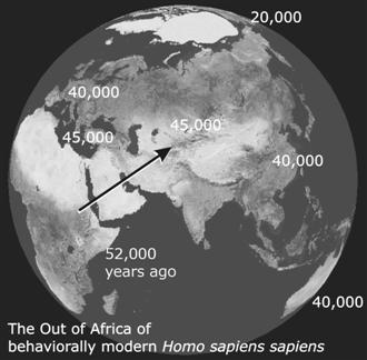 made it easier to scout out new territories. Almost all anthropologists (including the ones favoring the multiregional hypothesis for occasional interbreeding between Neanderthals and moderns) believe that all modern peoples on all continents are overwhelmingly descended from modern Africans. Between 60,000 and 40,000 years ago, behaviorally modern Homo sapiens sapiens spread into Asia, perhaps on both northern grasslands and southern shoreline routes. I won’t cover the many secondary migrations since then except to note that for the northern route into the steppes of central Asia, we have another important data point from Y chromosome studies: All non-African peoples (well, at least males) share genes that were present in central Asia about 40,000 years ago, suggesting a secondary center of spread from there that displaced the Neanderthals in Europe and the remaining Homo erectus in China. So think Out of Africa, followed by Out of the Steppes of Central Asia. First out of the cradle, then out of the nursery.