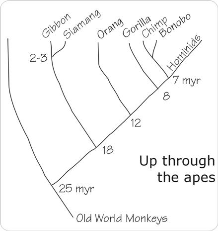 a common ancestor about 12 million years ago), the gorilla (about 8 to 10