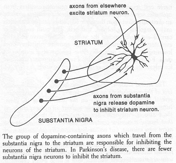 Deep in the white matter are other collections of gray matter, the nerve cells of the striatum (also called the basal ganglia). Still deeper, where the two cerebral hemispheres join with the long core of the brain (the brain stem), lies another large cluster of nerve cells collectively called the thalamus. Beneath the thalamus is a narrow band of nerve cells whose color is much darker than the usual gray, due to a pigment derived from the neurotransmitter dopamine contained within the cells. This group of nerve cells is called the substantia nigra ("black substance" in Latin), and their axons terminate in the striatum. As we shall see, they are among the nerve cells which are destroyed by Parkinson's disease. During the twentieth century, the electrical and chemical nature of nerve cells has become apparent. Different nerve cells specialize in the production of different neurotransmitter substances. Those in one part of the substantia nigra, for instance, happen to produce dopamine, which they release at the synapse in response to electrical signals such as impulses. In addition to transmitting one type of neurotransmitter, each nerve cell receives several different neurotransmitters from upstream nerve cells. Some of these neurotransmitters produce an excitatory effect upon the nerve cell; other neurotransmitters may antagonize, or inhibit, that cell. The push and pull is carried out by balancing the voltage of the nerve cell, the excitatory inputs raising the voltage and the inhibitory ones lowering it. Drugs may affect the process at a number of steps. For example, the amount of neurotransmitter available for release by impulses may be changed by drugs. The second student, who has been looking through binoculars at the convolutions on the surface of Neil's exposed brain, several meters (six feet) away on the other side of the glass, turns and says, "I read somewhere about an autopsy study on the brains of Parkinson's-disease patients. I think it showed that lots of dopamine-containing neurons in the substantia nigra were missing, but no one has ever really told us the story behind Parkinson's." "All right," says the neurologist. "I'll give you the three-minute capsule summary. In 1957, Carlsson and his co-workers were experimenting on animals with a drug which caused a massive loss of dopamine from the striatum. Their animals were rigid and moved around very slowly, just like Parkinson's patients. Then in 1960 came that autopsy study that you had heard about, in which Ehringer and Hornykiewicz found that dopamine was missing from the striatum of Parkinson's patients. "What is now obvious is that the dopamine in the striatum is the transmitter substance released from the axons of neurons which come from the substantia nigra. One of the reasons that there's so little dopamine in the striatum is that a lot of the substantia nigra cells have died. Now, you can apparently get the remaining cells to produce extra dopamine by providing them with more of the raw material from which they make dopamine -- that's the theory behind giving patients massive doses of levodopa, which is the molecule from which dopamine is created. But why do the neurons in the substantia nigra die?" The neurologist poses one of her favorite teaching questions.