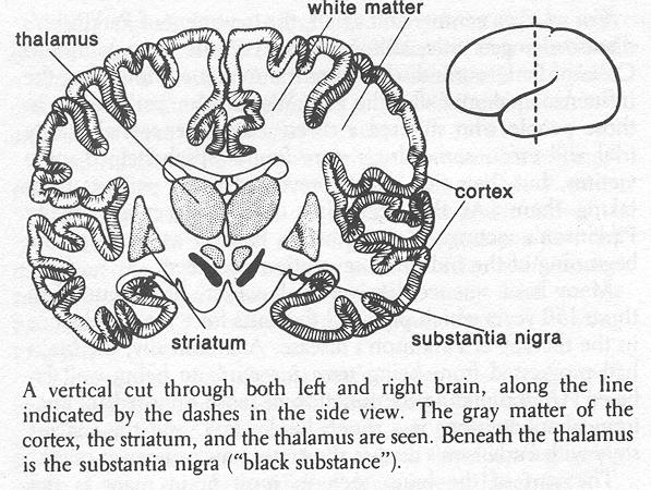 Down in the OR, the surgical team works in relative silence. The staff in the OR may not be as quiet or as reverent as a concert audience, but it is far quieter than the crowd in the glassed-in gallery, whose voices cannot be heard in the OR unless the intercom button is pressed. The visibility from the brightly lit OR into the darkened gallery is also poor, so the crowd can engage in wisecracks and imitations of the surgeons without serious chance of discovery. "Is this the first time you've seen a living, working brain," the neurologist asks one of the medical students standing near the EEG machine. "Yes, though I could see it better if the surgeon were transparent," complains the student, contemplating the surgeon's back. "I always thought brains were gray and hard. Turns out they are pink and soft. And look at the size of those blood vessels on the surface!" "Well, the brain does get one-fifth of everything that the heart pumps," comments the second student. "Got to carry it in something." "That's the middle cerebral artery in the center of the craniotomy opening," notes the neurologist, pointing. "What happens if it gets plugged up?" The students recognize the standard faculty teaching gambit, the rhetorical question. They respond by reciting to her the whole story of the middle cerebral artery, how it serves the speech and language areas of the brain, and they then rattle off the different kinds of aphasia which can result from blockage of it. "That's a nice job of covering the surface of the brain, but can you think of any areas in the depths of the brain concerned with speech?" she asks. "Well, the thalamus must have something to do with speech," ventures the first medical student.' "They presented a patient with Parkinson's disease in the neurology rounds the other day. He had an operation on his thalamus and was aphasic for several weeks after the surgery." "Yes, but lots of Parkinson's patients have trouble talking," points out the second student in a dubious tone of voice. "Their voices fade out when they talk on the phone and-" "Whoa!" interrupts the neurologist. "Suppose you first tell me about the Parkinson's-disease patient. Then we'll discuss treatments for Parkinsonism, and then come back to the aphasia. OK?" The neurologist is off on another teaching tangent. "This patient said that he couldn't get up out of a soft chair," the first student recalls, "and sometimes couldn't roll over in bed, or cut steak with a knife and fork. He would get stuck in one position and had a hard time getting going again. I guess that he had fallen down several times, too." "And . . . ?" "He had a tremor of his hands-no, it was only his left hand-that was most noticeable when he was resting. If you moved his left arm for him, it felt very stiff and would jerk a little -- that's 'cogwheel rigidity.' And of course he couldn't move his fingers very fast, and he didn't move his face much, either. His face looked like a mask, just like the textbooks say. His voice kept getting softer and softer as he talked to us. When we asked him to walk around the room, he took little steps and seemed ready to topple over -- just as if the top of him was trying to go faster than his legs." "And what treatments had he had besides the surgery?" queries the neurologist. "He's currently on levodopa." And, except for the drug called levodopa and the mention of thalamic surgery, the students' description of the disease is very much the same as that given by James Parkinson in 1817 in his Essay on the Shaking Palsy. As so often happens in medicine, it is simpler to identify a disease with a person's name than it is to give it a more meaningful (but longer) label. For nearly a century and a half, the treatment of Parkinson's disease changed little, although cases became more common. Cases of Parkinson's disease were more frequent following the influenza epidemic after the First World War, particularly in those people who suffered a severe case of encephalitis, By trial and error, some drugs were found which helped some victims, but their side effects prevented many patients from taking them. At the beginning of the space age, many Parkinson's victims were almost as bad off as those at the beginning of the industrial revolution had been. Many basic science discoveries, however, had occurred in those 150 years which provided the basis for a major advance in the therapy of Parkinson's disease. Anatomically, the brain had progressed from being terra incognita to being well labeled. Understanding the function of those hundreds of anatomical subdivisions is a much harder task, and the success story with Parkinson's disease illustrates how progress is made. The part of the brain seen in most brain maps is the cerebral cortex. It is a layer of nerve cells about 3 mm thick forming an outer shell. Something else - must occupy the rest of the brain's thickness. First of all, the surface layer is infolded rather like the skin of a green pepper, except much more so. This infolding increases the total surface area of cerebral cortex many times in the human brain; some mammalian brains, such as those of the rabbit and some New World monkeys, have very little infolding. Below the surface layer of nerve cells, there is a lot of "white matter." These are the axons of nerve cells entering and leaving the cerebral cortex. Their white appearance is due to the color of the insulation on the axons, called myelin. The white matter contains these insulated axons and the cells that support them and hold them together, called glia ("glue" in Greek). The white matter is thus analogous to a bundle of white cables running from one part of a computer to another. Gray matter is the name for the other areas, such as cerebral cortex, where insulated axons are not the overwhelming ingredient. In preserved brain, the color is grayer than that of the white matter"; in a living brain, "gray" matter is really a pinkish brown. Not only are there lots of ce