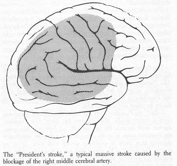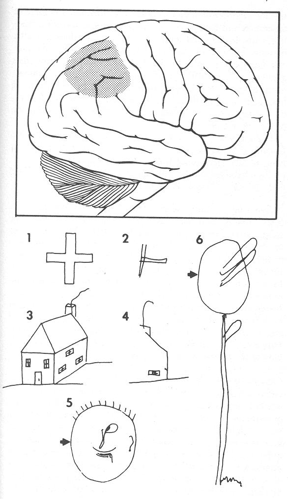 If it was the right hemisphere which was removed, language develops normally. In those who lost left hemispheres, speech develops, but not fully. They are considered quiet children, who use language only when necessary and then with a reduced range of grammatical expression. They tend to talk in the present tense; more elaborate constructions are beyond them. For example, when asked to repeat back the sentence "Wasn't the poor cousin helped by the old lady," one nine-year-old who had had the left hemisphere removed shortly after birth said, "Wasn't by the cousin helped by the old lady," while another recalled this sentence as "Wasn't the poor cousin . . . helped the old lady." Children with right hemisphere removals make few such grammatical errors. Apparently there is something wired into only the left brain, even at birth, that is essential for the full range of human grammatical expression. When language has been displaced into the right hemisphere by a missing left hemisphere, visual-spatial abilities also suffer, usually more than language. This, in a sense, is the reverse of the situation in dyslexia: in the dyslexic child, the abnormal presence of visual-spatial functions in the left brain impairs language; in these right-brain-only children, the abnormal presence of language impairs visual-spatial functions. Perhaps it requires more brain than is available in one hemisphere to do both things well. Despite this ability of the other side of the brain to pick up the load in early life, the underlying basis for lateralization is probably wired into the human brain. A number of anatomical differences can be seen between left and right brain if one looks carefully enough. These asymmetries are present in the developing fetus, not just in the adult. The best-known of these asymmetries involves a region on the top of the temporal lobe (the planum temporale), which is about the size of a large coin on the left side but the size of a small coin on the right side. This asymmetry is reversed (right side bigger than left) in just about the proportion of people that one would expect not to have language in the left brain. Like lateralization of visual-spatial function to the right brain, this asymmetry is greater in men than women. If this anatomical asymmetry is concomitant with the lateralization of language, might other animals also have it? Might it mark some of the final evolutionary steps toward language? Such an asymmetry has been identified in chimpanzee and orangutan, although their asymmetries are far less extensive (and thus harder to spot) than those of man. Chimpanzees have been taught simple language (using sign language, since chimps lack the requisite vocal development for versatile speech). The right brain is concerned with visual-spatial functions. Strokes that damage the right brain may leave the patient looking remarkably normal except, perhaps, for left-body paralysis if the stroke is large enough to also damage the right motor strip. But the fluent speech of such stroke patients conceals a severe deficit, a deficit that could have major consequences. Imagine the following drama: The President of the United States is lying in bed, waving his right hand at his Secretary of State in a gesture of dismissal. The President is alert and seems intelligent. He is talking forcefully, angry at his subordinate, who has suggested that the President is ill and perhaps should delegate some of his duties to others until he recovers. Indeed, the President's left side seems to be totally paralyzed -from a recent stroke. His left arm lies limp. The President cannot walk because his left leg will not function. However, the President seems blissfully unaware of this disorder, steadfastly denying that there is anything wrong with him. It is, of course, this denial of his illness that has particularly upset the President's personal and official families. They have tried to reason with him, pointing out to him that his left arm is lying there, paralyzed. But he denies that it is his left arm. Indeed, he is somewhat puzzled about what a strange arm and leg are doing in his bed with him. President Woodrow Wilson suffered a stroke in 1919, after he triumphantly negotiated the League of Nations charter but before he attempted to persuade the U.S. Senate to ratify it. The stroke paralyzed his left side. He denied his illness to the point of paralyzing his administration; he fired his Secretary of State for discussing the illness with the Cabinet. Such effects of right-brain strokes were only beginning to be recognized by neurologists of that era. Today, the "denial of illness" syndrome is well known, and the typical symptoms of its victims have been ascribed to our president of the above paragraph. It illustrates how the right parietal lobe plays a role in the perception of one's own body image; if one cannot perceive anything about the left side of the body, to say nothing is wrong with it does exhibit a certain logic. Less severe strokes provide another illustration of parietal lobe function. In a small right-brain stroke confined to the parietal lobe, there may be no paralysis, no visual defects, no other sensory defects of the usual sorts. Indeed, the person appears normal. But if the patient is driving a car approaching an intersection, though he can see cars approaching from the left just as easily as he can see cars coming from the right, if cars approach from both directions at the same time, the patient is likely to pay attention only to the one coming from the right. He may never realize that the left one exists, unless, of course, a collision happens to occur. If touched on both hands at the same time, he may notice only the touch to the right hand. It may be very difficult to persuade such a patient that he should not drive a car. He may not be able to tell that anything is wrong with himself. He cannot perceive his own deficit in perception. It is this loss of insight into one's own abil