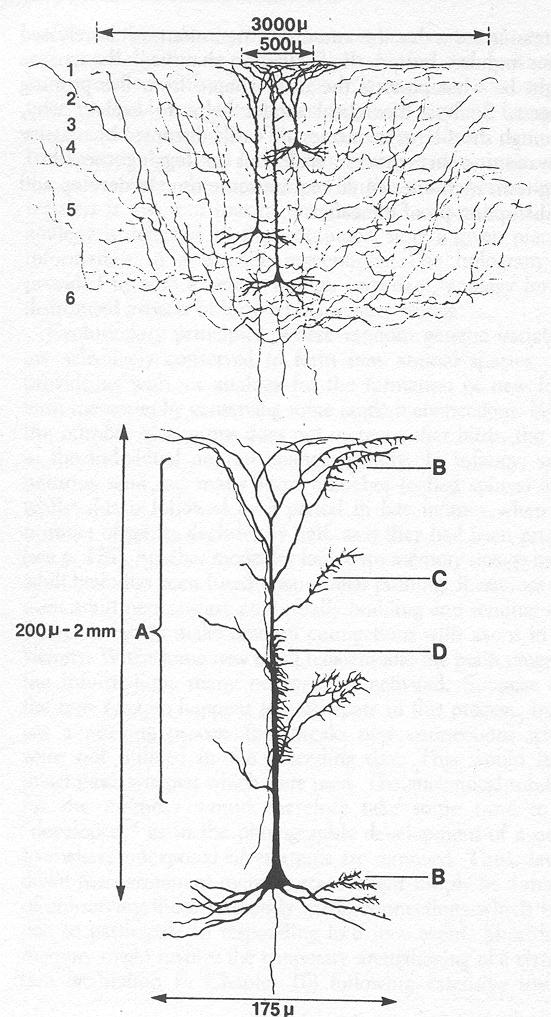 Synaptic inputs to a large cortical neuron come from many sources. Those from the reticular activating system (A) are widely distributed up the dendritic tree. Inputs from neighboring cells (13) arrive at the top and bottom dendritic branches. Inputs from the opposite hemisphere (C) and the thalamus (D) end upon middle regions. At top: Drawing of three large cortical neurons shows their axons entering the white matter at bottom, but axon branches going to neighboring regions of cortex. Note that axons spread over a wider area than do dendrites (from Scheibel and Scheibel 1970). |
