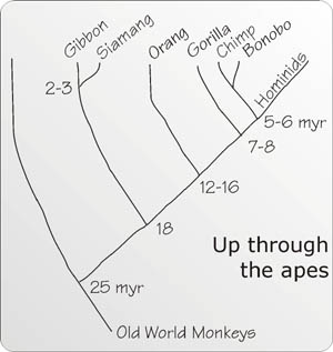 ancestor with the chimps and bonobos was 5-6 million years ago, and