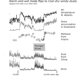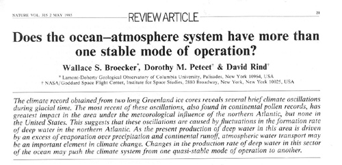 But the popular press has a pigeonhole labeled “Greenhouse,” into which all climate change news is forced – and then either put down as “old news” or given the tired old “Has it really started yet?” treatment.  Even worse is to assume the cooling will cancel out the warming, just as you turn up the cold water if the hot water supply suddenly improves in mid-shower.  They have repeatedly missed the point that, rather than “averaging out,” a gradual warming may trigger a dangerous cooling – a backlash.  A climate full of whiplash coolings and warmings isn’t a prediction but a newly-acquired historical perspective.  What happened many times before is likely to happen again, unless we figure out a means of stabilizing the climate.