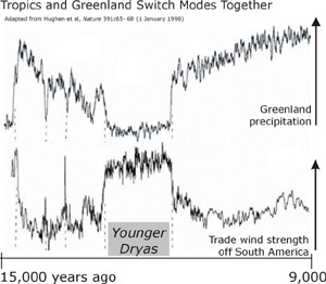Ancient lakes near the Pacific coast of the United States, it turned out, show a shift to cold-weather plant species at roughly the time when the Younger Dryas was changing German pine forests into scrublands like those of modern Siberia.  Subarctic ocean currents were reaching the southern California coastline, and Santa Barbara must have been as cold as Juneau is now.  (But the regional record is poorly understood, and I know at least one reason why.  These days when one goes to hear a talk on ancient climates of North America, one is likely to learn that the speaker was forced into early retirement from the U.S. Geological Survey by budget cuts.  Rather than a vigorous program of studying regional climatic change, we hear the shortsighted, preaching of cheaper government at any cost.  These penny-wise-pound-foolish factions of the U.S. Congress even tried hard in 1995 to eliminate the U.S. Geological Survey altogether.