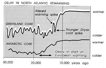 Such may explain the European transition from full glacial times 20,000 years ago to the ice-free conditions of 8,000 years ago: Europe was lagging behind the Southern Hemisphere in warming up during the 15,000 to 13,000 year period. Then, within only a fraction of a century, Europe warmed a few degrees as if catching up: this "warming spike" is what is called the Allerød event at 13,000 years ago. Then, of course, at about 11,500 years, Europe flipped back to cold for 800 years (the Younger Dryas "cold spike"), then suddenly warmed (and continued warming more gradually into the interglacial). So the complete flip up-and-back-and-up again took 2,300 years. [1994 Update: The current dating of the Younger Dryas onset is 13,000 years ago rather than the 11,500 mentioned in this 1990 manuscript. And the abrupt climate changes are even more frequent than then appeared: see Wallace S. Broecker, "Massive iceberg discharges as triggers for global climate change." Nature 372:421-424 (1 December 1994). For updates on El Nino, see El Nino tuitorial from NOAA.]