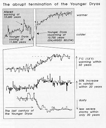 Most of the cold spikes in the last 120,000 years in the North Atlantic have probably lasted several centuries, rather than the eight centuries of the Younger Dryas. And even more rapid ones could have occurred without our knowing about it yet. Really rapid spikes are something that researchers will be looking for, as they analyze cores with newer techniques. Some didnt take Dryas-like flips seriously for decades ("Just noise in those pollen records") because such layers didnt show up in all the various kinds of cores; spurious readings are one of the things that scientists have to guard against. But the seafloor (and likely some lake-bottom) layers had, alas, been smoothed out by the worms; their churning of the ocean floor served to smear together the sediments from over 6,000 years, obscuring any rapid fluctuations.![]()
