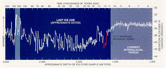 Ice core data of Dansgaard et al Nature 1993. Younger Dryas shown in red. Note the two episodes during the warm period 130,000 years ago.THE ABRUPT CLIMATE CHANGE in the relatively recent past, merely 11,500 years ago, leads one to ask how often these things normally occur, even without a greenhouse warming. My count of the published records from the Greenland ice cores is roughly 20 cold spikes in the last 120,000 years for the North Atlantic region. And so that is 40 sudden changes, either sudden cooling or sudden warming, every 3,000 years on the average. It seems urgent that we use simulation to help figure out whether we might accelerate mode-switching behavior with our rapid forcing of the climate (via greenhouse gases), whether we might (as the first round of such simulations of the North Atlantic Current suggests) trip one of those abrupt climate changes.