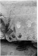 All sorts of pictographs and petroglyphs are to be seen under overhangs. Some of the art depicts men on horseback, a clear giveaway that the Anasazi didnt draw it since North America lacked horses and humans together until the Spanish reintroduced the horse after 1540. Such art is likely Navajo, or even due to the Anglo cow herders of the last century. The themes of Anasazi art are not realistic: their humanlike figures often involve distortion on a grand scale. Barrel chests tapering to narrower hips, with little feet and pinheads. Hand prints are the most realistic depiction, since they had a model to trace. And there are occasionally straight lines in a row, looking for all the world like tally marks. Their meaning is unknown, and I couldnt preferentially find groups of six or twelve. No clenched fists, either. |