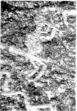 The original archaeologists had apparently faced this problem before us, and created a suitable campsite under the overhang but away from the ruins. It was just large enough to accommodate our party. And our leader was an archaeologist who knew the site quite well, and could keep us from doing harm. So I stayed dry that night after all. The place was comfortable, as rock shelters go; the ruins are in an elevated portion around the corner and look down on the floor where we were. The light was poor, so we put off exploration until morning. The evening was memorable. I had gone to sleep even before sunset, up on a slab of rock that angled toward the ceiling. I awoke several hours later after dark, strangely disoriented. I saw firelight and flickering shadows on the caves ceiling, just as some Anasazi must have done, a thousand years earlier. Great distorted shadows moved across the ceiling as someone shifted position near the campfire. I heard an ethereal voice and a mandolin. I can believe in an Anasazi with an ethereal voice, but I had trouble with the mandolin. The Anasazi, I believe that I can say with certainty, did not possess even a single mandolin. But Don Keller does and, having carried it atop his backpack, he was engaging in an archaeologists evening entertainment in the resonant surroundings of a cliff dwelling. I lay there under the flickering ceiling and listened for a half hour before getting up and joining the group. Such are my experiences as a temporary troglodyte. The next morning, we explored the ruins and looked up into a corner of the ceiling, well out of reach. There, all by itself, was the pictograph that gave the site its name. It depicted a green face mask, which was utterly unlike any of the Anasazi or Navajo art that we had been seeing. Don said that it is Basketmaker II in style, which in local archaeological usage tends to mean 200-400 A.D. |