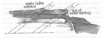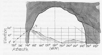 THE ALCOVE at Perfect Kiva also allows you to play an interesting game in the weeks before and after the winter solstice, provided that the observer is allowed to move each day. Now ordinarily, given those horizon calendars like the Palisades of the Desert, we think of the observer returning to the same viewpoint morning after morning, seeing the sun rise in different positions, marching south, pausing, and then heading back north. There is a standard observer but the view is of a moving sunrise.