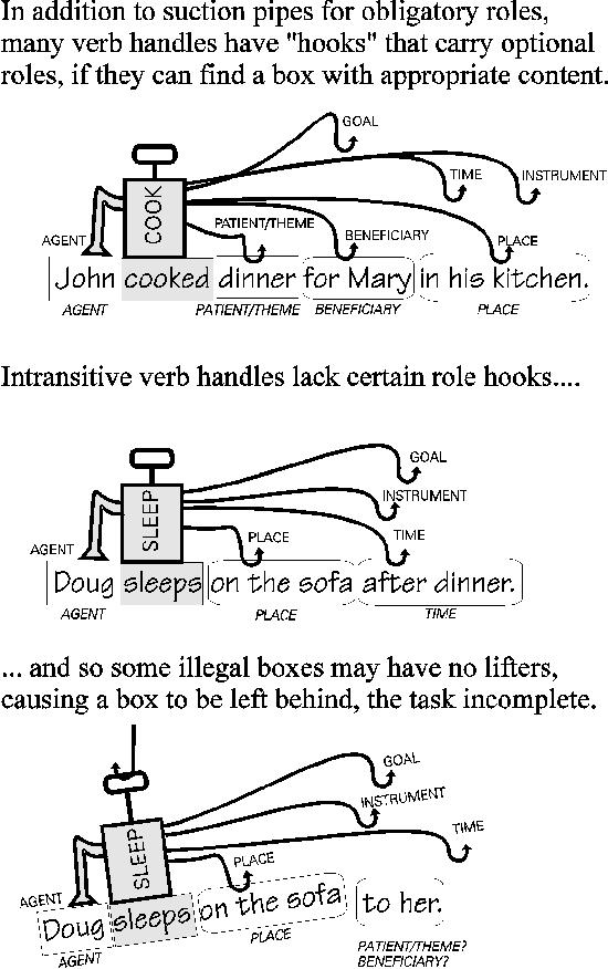 Sometimes the suction tips and optional hooks need some guidance to find an appropriate target: for example, SVO might help the subject tip find the appropriate noun phrase as might a case marker, such as he. Other inflections help out, like gender or number agreement between verb and subject. The suction tips and the hooks could come with little labels on them for Beneficiary, Instrument, Negation, Obligation, Purpose, Possession, and so forth, mating only with words appropriate to those categories. Being able to lift the verb handle and carry all the packages, leaving none behind and with no unfilled suction tips, is what constitutes sentence recognition in this particular grammar machine. If a suction tip cant find a home, no vacuum develops when you lift the handle, and your construction isnt carried away. Theres no sense of completion. As noted, each verb, once identified by the lingua ex machina, has a characteristic handle type: for instance, handles for intransitive verbs such as sleep have only the one suction tip for the subject, but they have optional hooks, in case there are any extra phrases to be hauled along. Sleep will support optional roles such as Time (after dinner) and Place (on the sofa) but not Recipient. Theres usually a vacuum tip for an Agent (though sometimes there isnt an Agent say, in sentences like The ice melted), perhaps other role-related suction tips, and some hooks for other possible roles in the verbs storytelling repertoire. And, of course, the same boxes-inside-boxes principle that allowed a prepositional phrase to serve as a noun can allow us to have sentences inside sentences, as in dependent clauses or I think I saw....