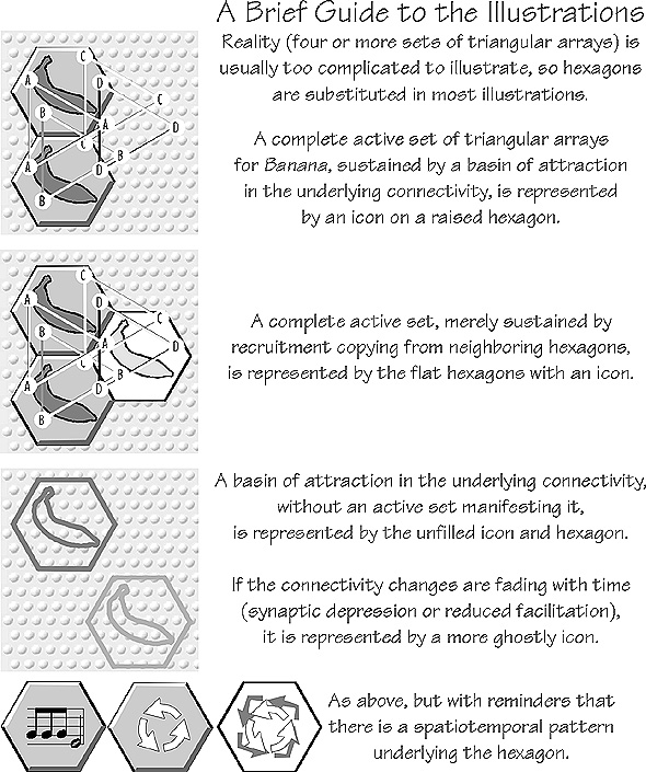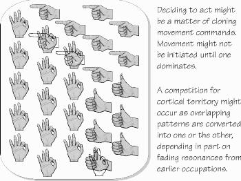![]() The map is not the territory, as various people said earlier in the century, but Arbib goes on to emphasize that our job as brain theorists is not to replace a life richly lived by the running of some computer program. Weve got to extract something simpler, a maplike guide to the underlying complexity, despite the seeming functional incomprehensibility of those cells in the hidden layers in connectionist networks. We need brain abstractions such as common processes, used again and again in order to appreciate the fine details. Among the abstractions that have recently been helpful are those six essentials of a darwinian process: a characteristic pattern that is copied, occasional variants that compete for a work space, with success biased by a multifaceted environment, and with the more successful producing most of the next round of slight variants (Darwins inheritance principle). In the last chapter, we saw how copying mechanisms also helped identify a characteristic pattern. The predicted mosaics of electrical activity are just one ephemeral state of the cerebral cortex, but they may provide a guide to what else it does. If we can learn to think about the dynamically reforming patchwork quilt of cloning territories as simply as we think about maps, perhaps we can find a way around the hidden-layer incomprehensibility. This chapter (far easier than the last two) will address the variant patterns and the work space itself, and later chapters will consider cloning competitions in more detail. In between is some chaos, in the best sense of the word, that underlies the memorized environment. But first we are going to need some metaphors to guide us in exploring a jack-of-all-trades work space. We need a lot of multifunctional potential (potentially powerful, but it makes it difficult to name things) rather than a lot of fixed compartments.