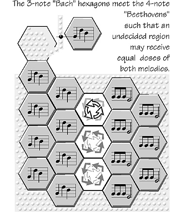 compete with its parent pattern? There is clearly the possibility of the aforementioned error correction preventing any variations on an established pattern, once a given hexagon is surrounded by like-minded ones for crystallization tendencies to assert themselves. But on the edges of a paver area, bordering an unorganized area, a hexagon may only have three or four neighbors. Furthermore, some geometric arrangements of barriers allow only two neighbors to an unorganized hexagon. It is on such frontiers that we should first look for variant patterns, not within the continents. Most simply, a hexagonal variant could be caused by the failure of one or more of the triangular arrays to clone new nodes. The spatiotemporal melody within the hexagon would be missing a note, in the manner of a piano with a dead key. This loss of detail might mean the dropout of one attribute, such as color, but not necessarily. When we say yellow or horizontal, we are only emphasizing the most easily investigated attribute of our feature detector (itself a convenient fiction). Many interneurons are multisensory and so a given triangular array need not represent a modality that is orthogonal to all other attributes.
