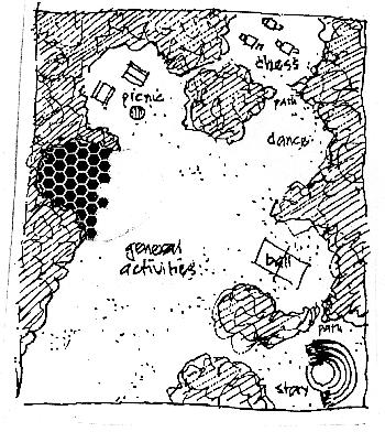 What, you wonder, will happen when the army of cat pavers comes face to face (well, edge to edge) with the dog ones? Will dog pavers replace cat pavers and start taking over the cat territory? Is the size of the dog territory important for some reason? Now, if these were the hexagonal mosaics predicted for cerebral cortex, someone would surely suggest that they have to all fire in synchrony, binding them together so that they will be noticed by an observer on high. Id prefer to suggest (just wait for chapter 8) that theres a critical number needed before theyre likely to communicate effectively with the motor centers of the brain. Indeed (arent reveries fun?), leaving aside the cartesian theater fallacy for the moment, what might you see from an aerial photo of this park? Probably lots of alcoves (thanks to those barriers known as foliage) opening off the central spaces, though the extent of the alcoves will be obscured by the overhanging tree branches, as will some of the paths between them (thats one advantage of a map over an aerial photo and shows why an abstract schema can improve on a rich mental image).