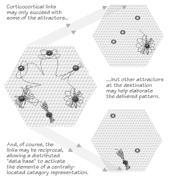 to the local basins of attraction. But they ought to differ in detail, to arrive against a different set of resonances, biased by different ratio of neuromodulators and so the competitive outcome could be very different than back home. Just as emigrants may thrive in distant places, so faux faxed spatiotemporal patterns might find a completely different reception in the distant cortex. Typically, of course, dying out without issue, but occasionally thriving. Not all of the parent attractors may arrive intact; even when they do, they arrive against a very different background of passive attractors than existed back home, both from short-term and long-term memories residing in the target hexagons. Furthermore, there may be several faux faxes arriving at the same time from different senders which means we have a new form of competition, quite in addition to the side-by-side dog and cat pavers type of lateral competition for space introduced in chapter 4. For all these reasons, the spatiotemporal patterns in the target region may not be mere superpositions of the contributors, those jazz performance overlays. In Hebbs other dual trace memory system, you can get melding of attractors in bilingual belts from noncontemporaneous occupations of the target area. Such exotic combinations are best introduced, probably to no ones surprise, after a preliminary reminder about sex.