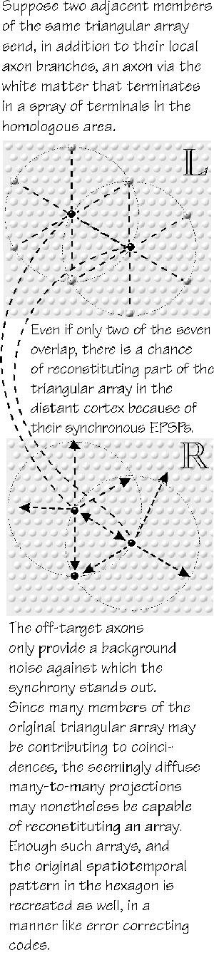 that NMDA mechanisms are involved and, given all the repetition to clean out the Mg Even allowing for a fair amount of imprecise topographic mapping and a certain amount of temporal dispersion along the way, I think that a large enough sending area can get a small territory of similar arrays going in the target cortex (except, perhaps, for a change in the 0.5 mm metric to reflect that typical of the target cortex). Error correction can shape up a standard version of the one-note triangular array in the distant cortex. If that happens for many of the triangular arrays, the spatiotemporal pattern at the target cortex is likely to be close to the tune playing back home. The distant terminals might also prove to have the second annular ring of fanout branches as seen back home at twice the local metric distance; that would provide another six possible synchronized inputs. Only a few of the thirteen could suffice to start up a repeater node; only two such adjacent repeaters could suffice to start a local triangular array that can extend itself.